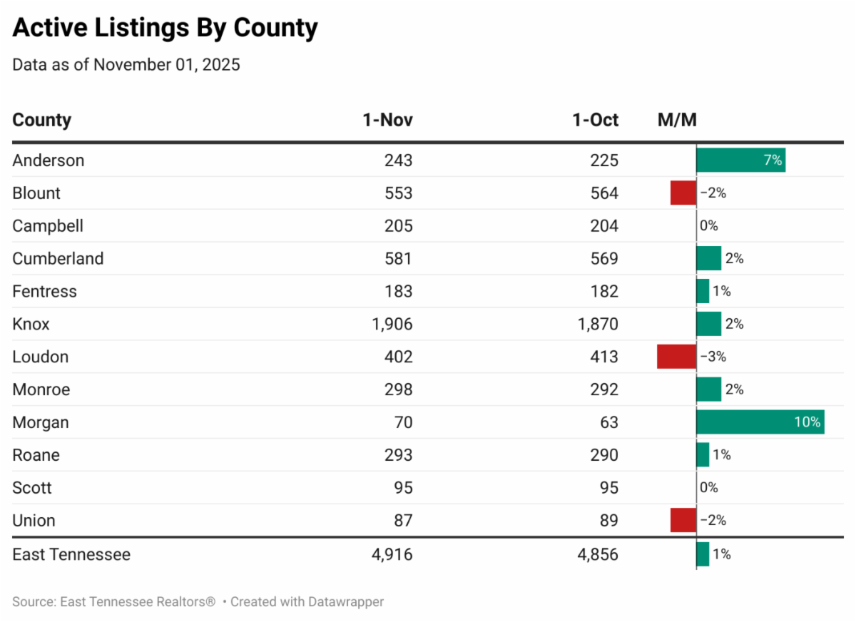 Out of the 12 counties in the East Tennessee REALTORS® footprint, 7 marked measurable increases in active listings over the month of October. Overall, regional inventory increased month-over-month by 1%.