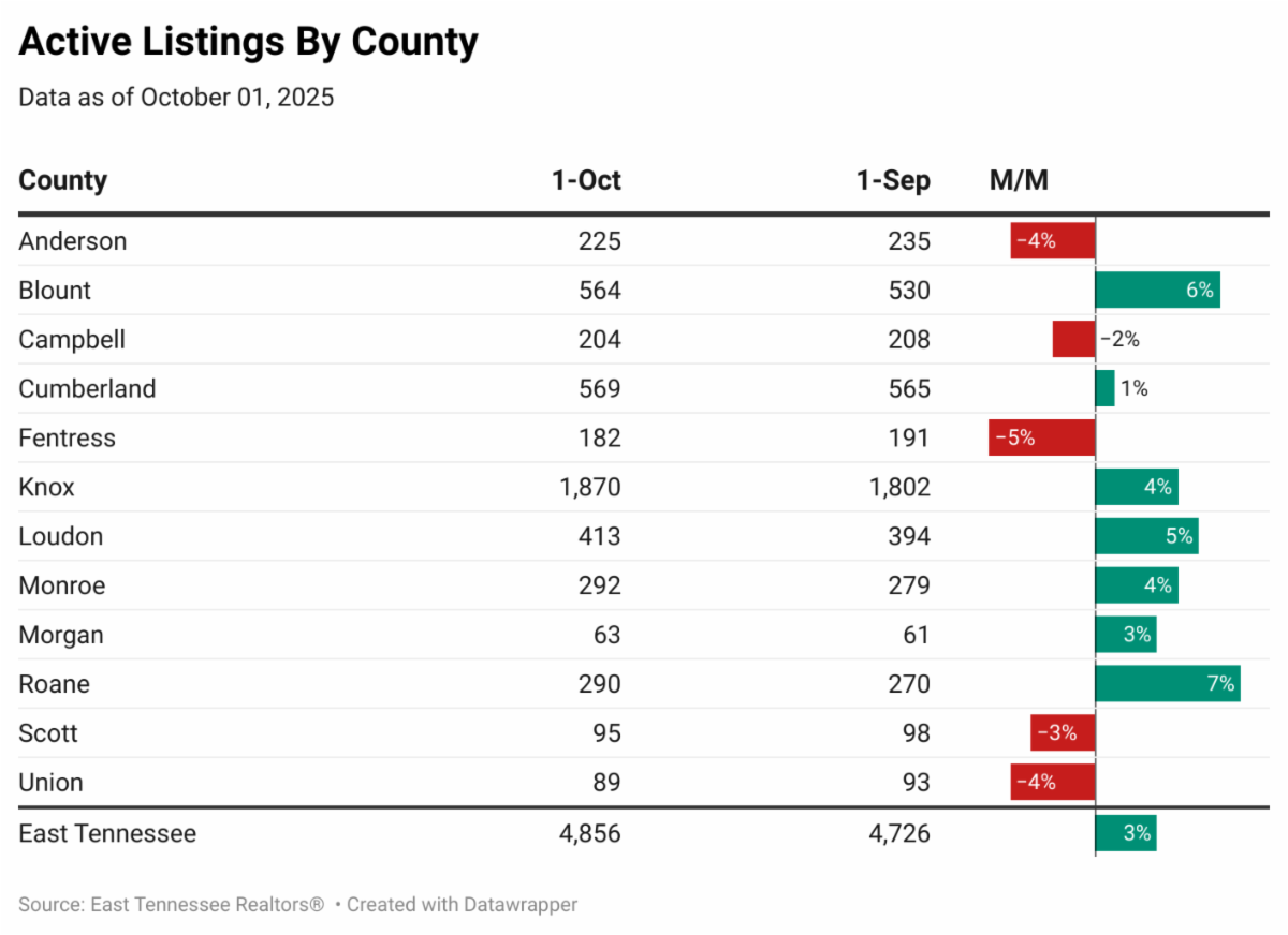 Out of the 12 counties in the East Tennessee REALTORS® footprint, 7 marked measurable increases in active listings over the month of September. Overall, regional inventory increased month-over-month by 3%.