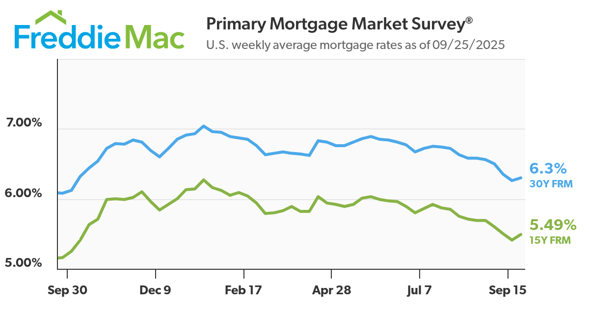 According to Freddie Mac's Primary Mortgage Market Survey, the 30-year fixed mortgage rate (30Y FRM) dropped to a low of 6.26% as of the week ending September 18, but then bounced up after the Fed conference to 6.3% for the week ending September 25 compared to 6.08% one year ago.