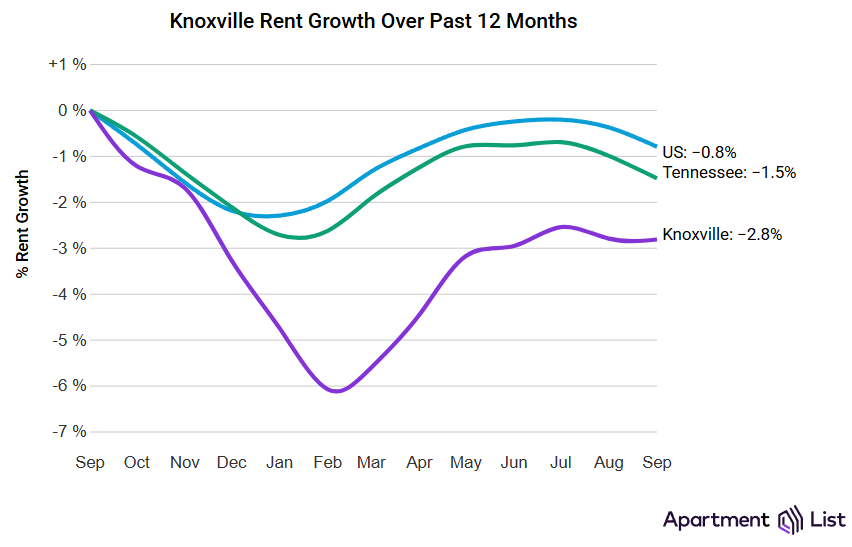 According to the latest Apartment List report, rent in the Knoxville area market has stayed the same over the last month, grown 2% so far in 2025, and year-over-year is down 2.8% from August 2024. The modest growth this year can be attributed to a slowdown in multifamily permitting and apartment additions, with RealPage projecting that only 1,208 new units will be completed in 2025 compared to 1,505 in 2024.