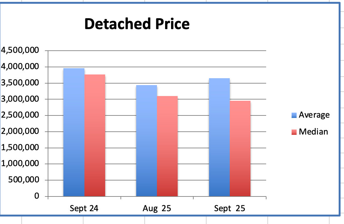 In September the westside Detached Home average price was $3.646M, down 23% from $4.744M, the peak, in August 2023.