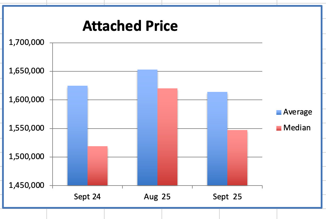 The Attached home average price was $1.614M, down 14% from $1.885M, the peak, in Dec 2024.