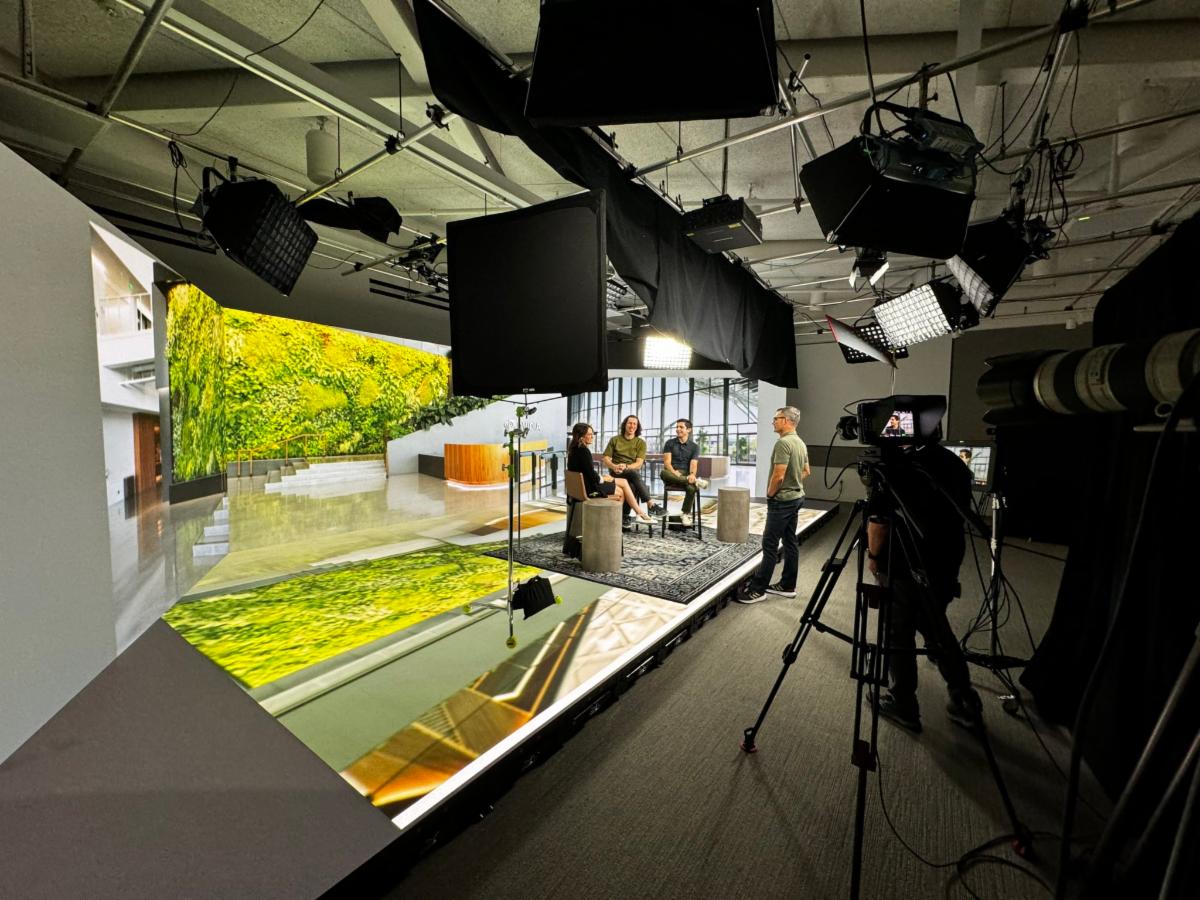 And, fun fact, the background, which looks like an office lobby, was actually three walls of LED screens.