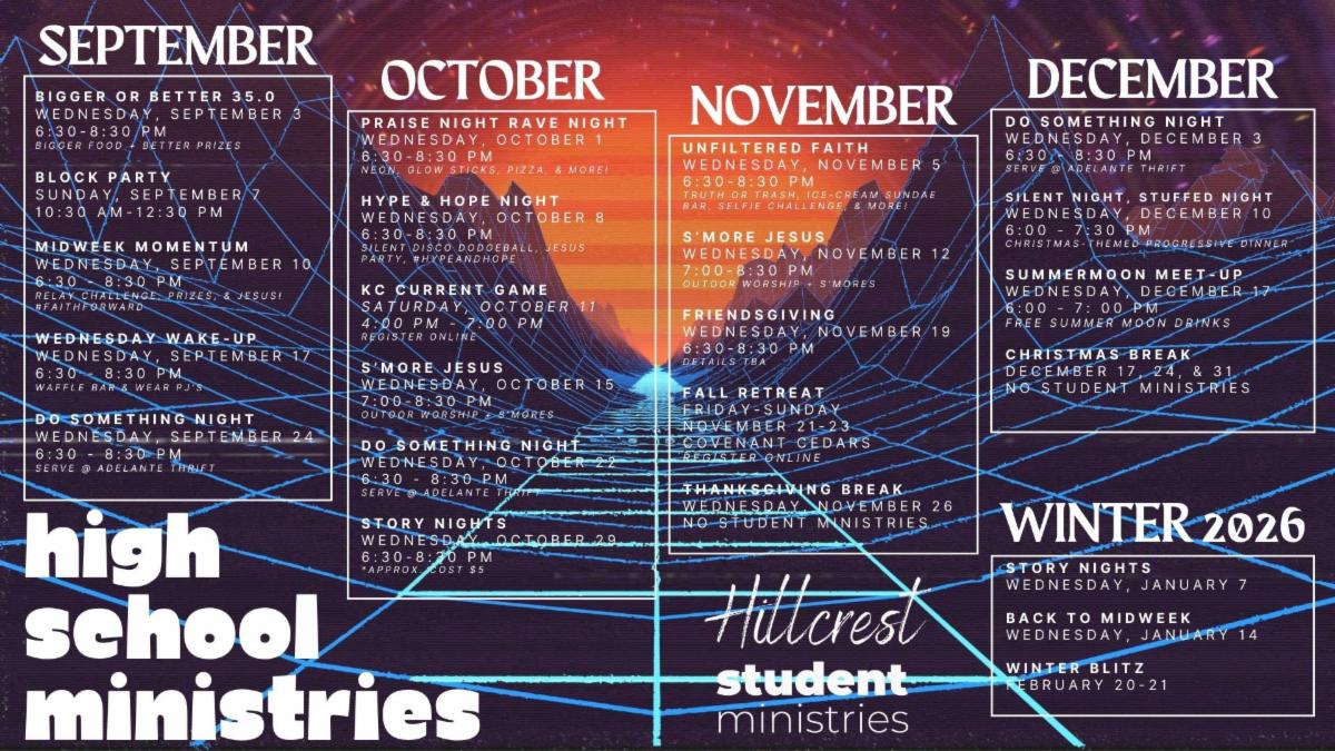 | | For what's just ahead, see below or here... | | | | Serve at Adelante Thrift on Saturday, October 11 | Serve with other Hillcresters on the second Saturday of each month from 10 AM to noon. We'll sort, hang up clothes, and do some light cleaning. Meet at 3720 State Ave., Kansas City, KS. Sign up here... | | | Starts Sunday! 4-Week Spiritual Parenting Class, October 5 to 26, from 10:45 to 11:45 AM in the Chapel. We'll rethink what it means to raise kids who know and love Jesus, explore ideas like identity, storytelling, serving, and being in community. For parents of toddlers through preteens. See here for more and to sign up. | | | Infant Baptism & Child Dedication on Sunday, October 19 | Baptism and dedication are beautiful ways to commit your child to God and invite your church family to walk with you in that journey. Infant Baptism during the 9 AM service. Infant or Child Dedication during the 10:45 AM service. Register here... | | | | | Caregivers Support Group meets on Tuesday, October 28, from 1:30 to 3 PM in Room 203. Caregivers need care and encouragement, too! This once-a-month group gathers to listen and pray with each other. Please use the office entrance. | | | Save the date! Song & Story Night is Wednesday, October 29 from 6:30 to 8:30 PM in the sanctuary | Get ready for an incredible night with our whole church family! Join us for worship, prayer, and powerful stories of how Jesus is changing lives. Song & Story Nights are a chance for kids, students, and adults to share their stories and celebrate God’s work among us. Don’t miss this special evening to gather, worship, and be reminded of God’s power to transform lives. FREE Chick-Fil-A nuggets and fries for everyone who shows up. See you there! | | | Hillcrest Student Calendars! | | Fall Middle School and High School Calendars | Check out what's happening this September, October, November, and December for students at Hillcrest! Whether on Sundays in the Student Lounge from 10 to 10:45 AM or on Wednesdays at the Student Center or out in the community, there are lots of opportunities for students to connect, grow, and have fun! Want to learn more? Email Jason at jheppner@hillcrestcov.org. | | ONE DAY! MULTIPLE OPPORTUNITIES TO REACH OUT! | | |