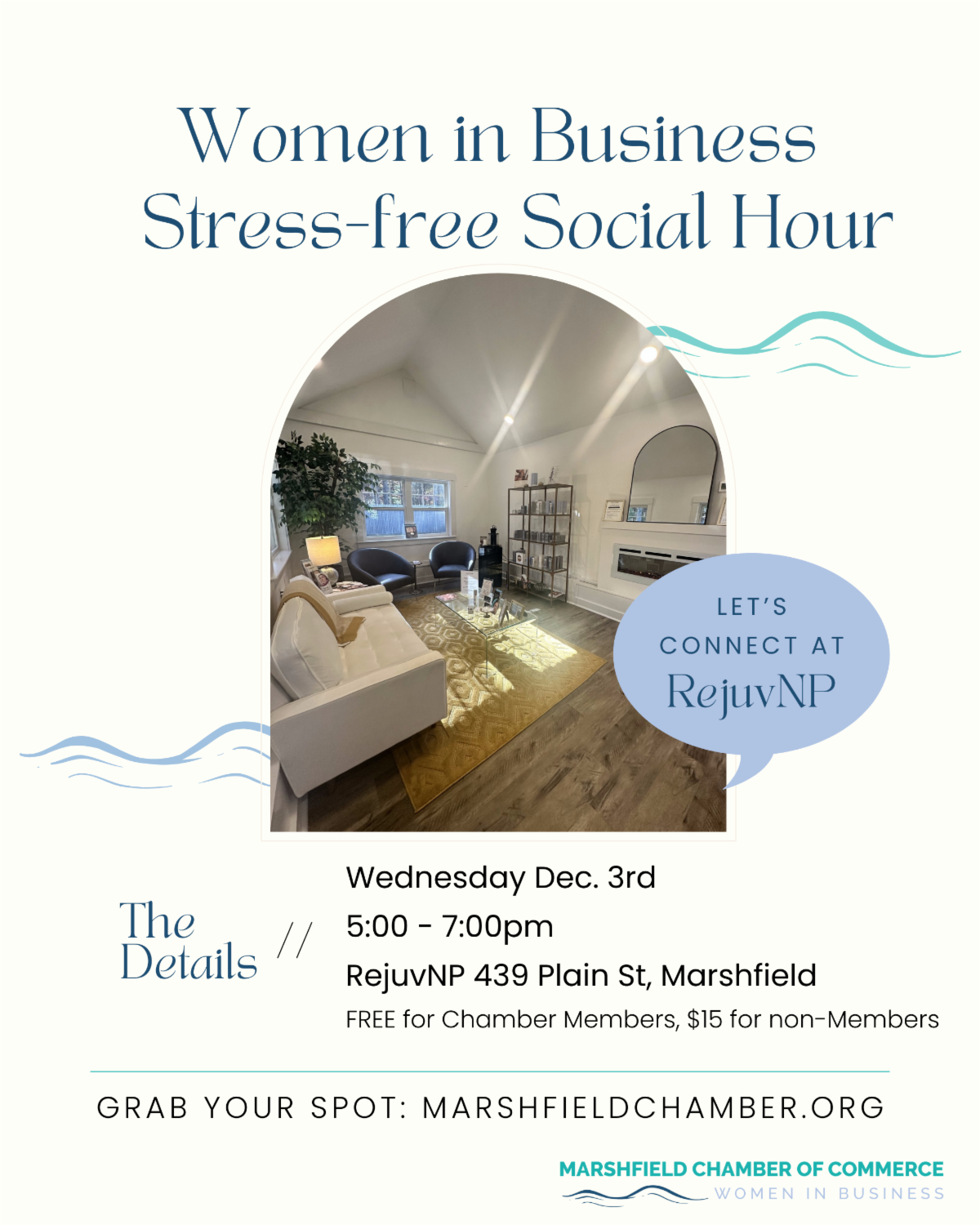 | | Ladies! Let's get together! Join the Marshfield Chamber of Commerce's Women in Business group for another Stress-Free Social Hour on December 3rd at RejuvNP. Connect with fellow female professionals, make some authentic connections, and maybe even treat yourself to a little self-care going into the holiday season! Light bites and sips will be provided, and the amazing RejuvNP staff will be offering services. You won't want to miss it! | | |