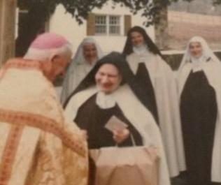 Archbishop Lefebvre greets his sister, Mother Marie Christiane, one of several of his sisters who became nuns. Mother Marie Christiane played a significant role in the establishment of the Carmelite convent in the United States. She founded the American Carmel in Phoenixville, PA, in 1985. She passed away in 1997.