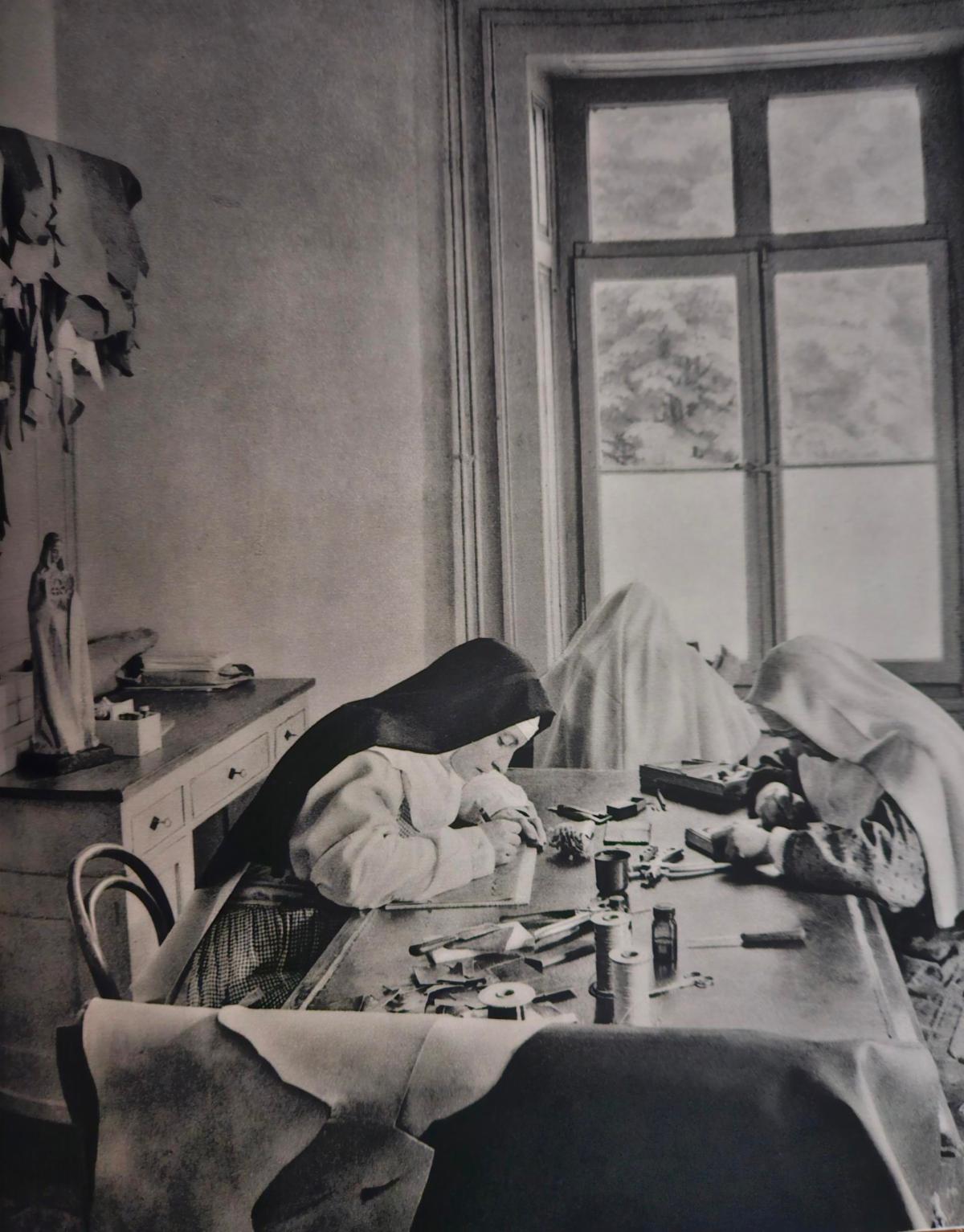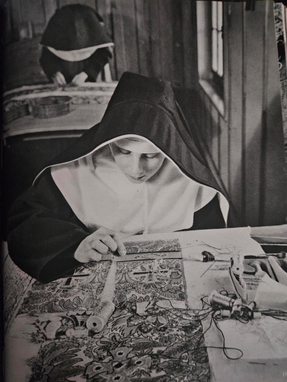 | | Sisters deftly sewing vestments and working with leather as part of their activities. | | |