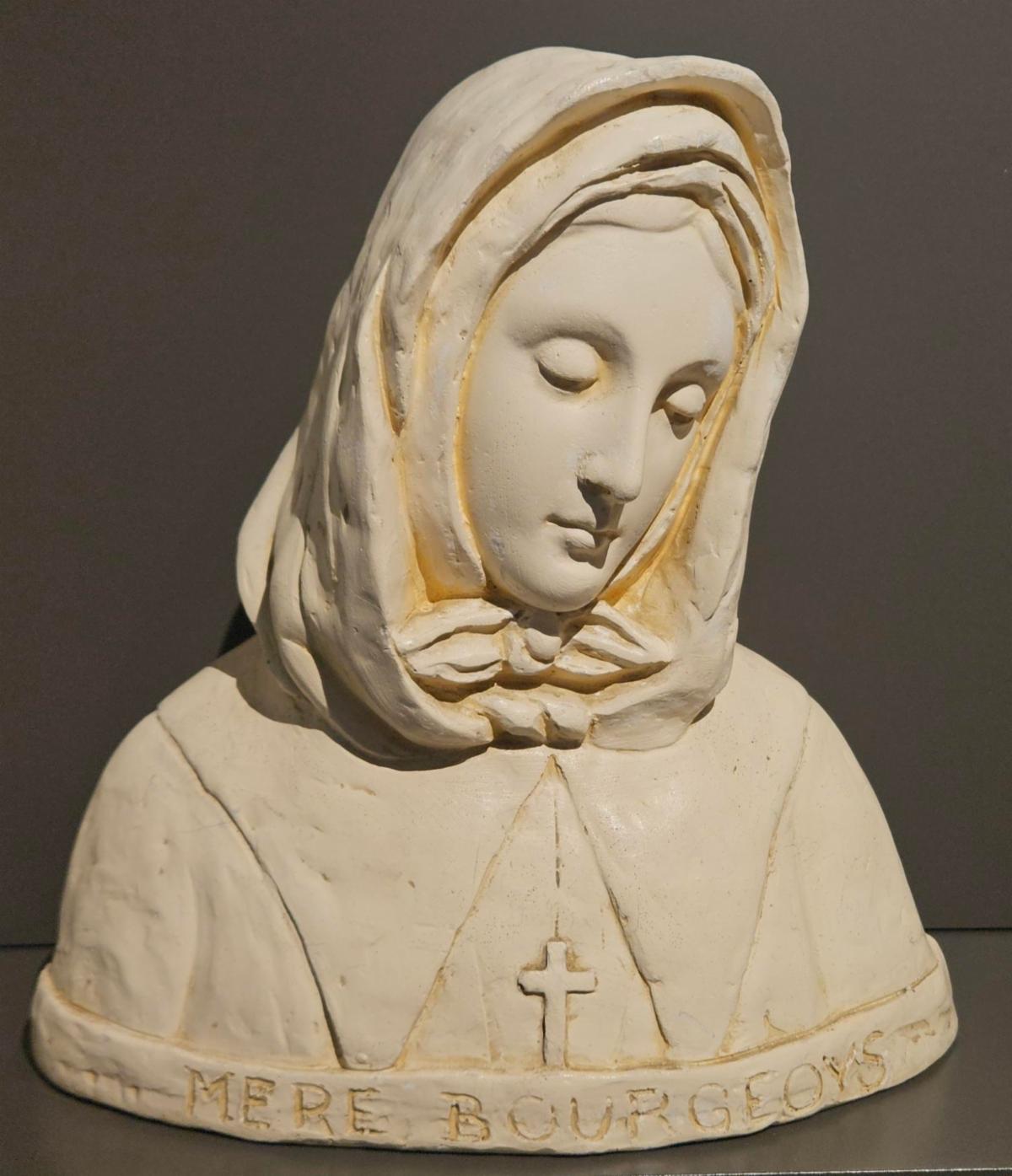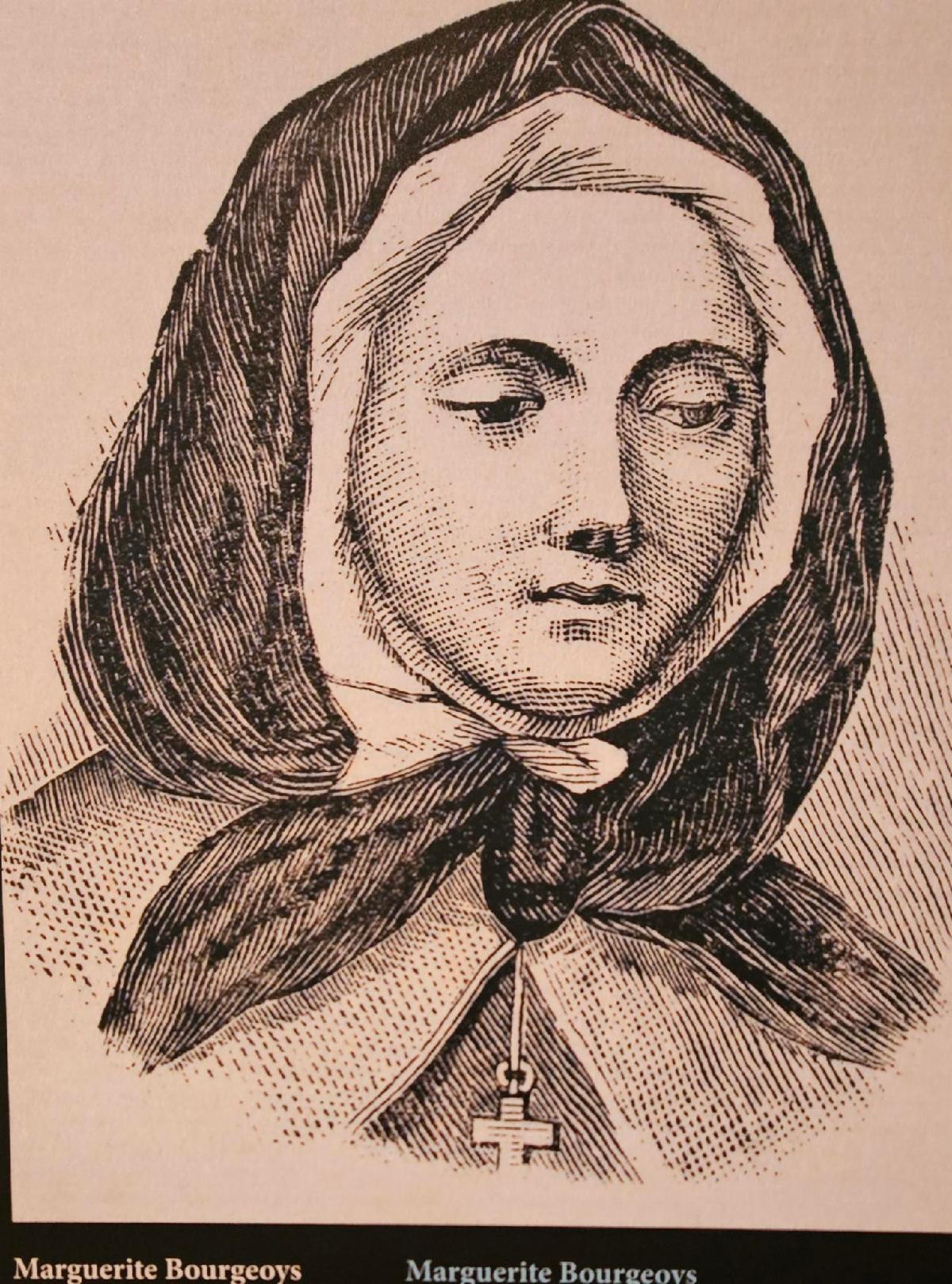 A sculpture and pencil drawing of the St. Marguerite Bourgeoys from her Shrine in Canada. It is located at the Notre-Dame-de-Bon-Secours Chapel in Montreal, Quebec. This site is significant as it is the oldest historic place in Montreal that has maintained its original function as a destination for pilgrims. The chapel was built in 1771 over the ruins of an earlier chapel, was originally constructed in 1655 by St. Marguerite Bourgeoys, who brought a statue of Our Lady of Good Help to the site,