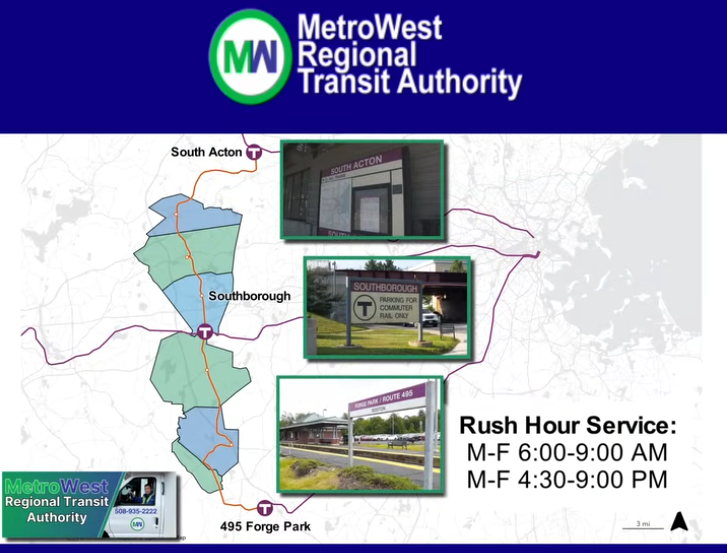 Running between the South Acton MBTA commuter rail station in the north and the Forge Park/ 495 MBTA commuter rail station in the south, the service includes scheduled stops in Hudson, Marlborough, Southborough (MBTA commuter rail station), Hopkinton, and Milford, with riders having the ability to request stops or flag down the shuttle at safe boarding locations. The service connects three commuter rail lines, five MWRTA fixed bus routes, two MWRTA catch connect zones, and eight 495/MetroWest communities.