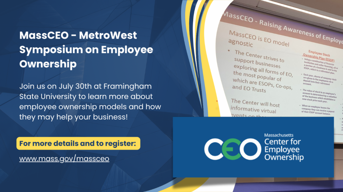 The Mass. Center for Employee Ownership will host its MetroWest regional symposium on Wednesday, July 30th at 9:00 AM at Framingham State University. Employee ownership offers succession planning opportunities for business owners alongside benefits such as increased worker engagement and productivity, improved employee recruiting and retention, democratic business governance, and wealth building. Attendees will learn about various employee ownership models, hear from employee-owned firms, explore available state and federal funding opportunities, and participate in roundtable discussions. Click here to register for the event.