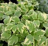 Snow on the Mountain (Ageopodium podograria) is a perennial that is hardy in USDA plant hardiness zones 3 through 9. It prefers full sun exposure in average, dry to medium, sharply drained soils. The plant is valued for its variegated foliage and long-lasting white flowers, creating the appearance of snow: NOTE: "The plants spread by means of brittle underground rhizomes, and digging up unwanted plants often causes them to spread even more because broken bits of rhizomes quickly form new plants." NOTE: Growing is not recommended. Find more information here.