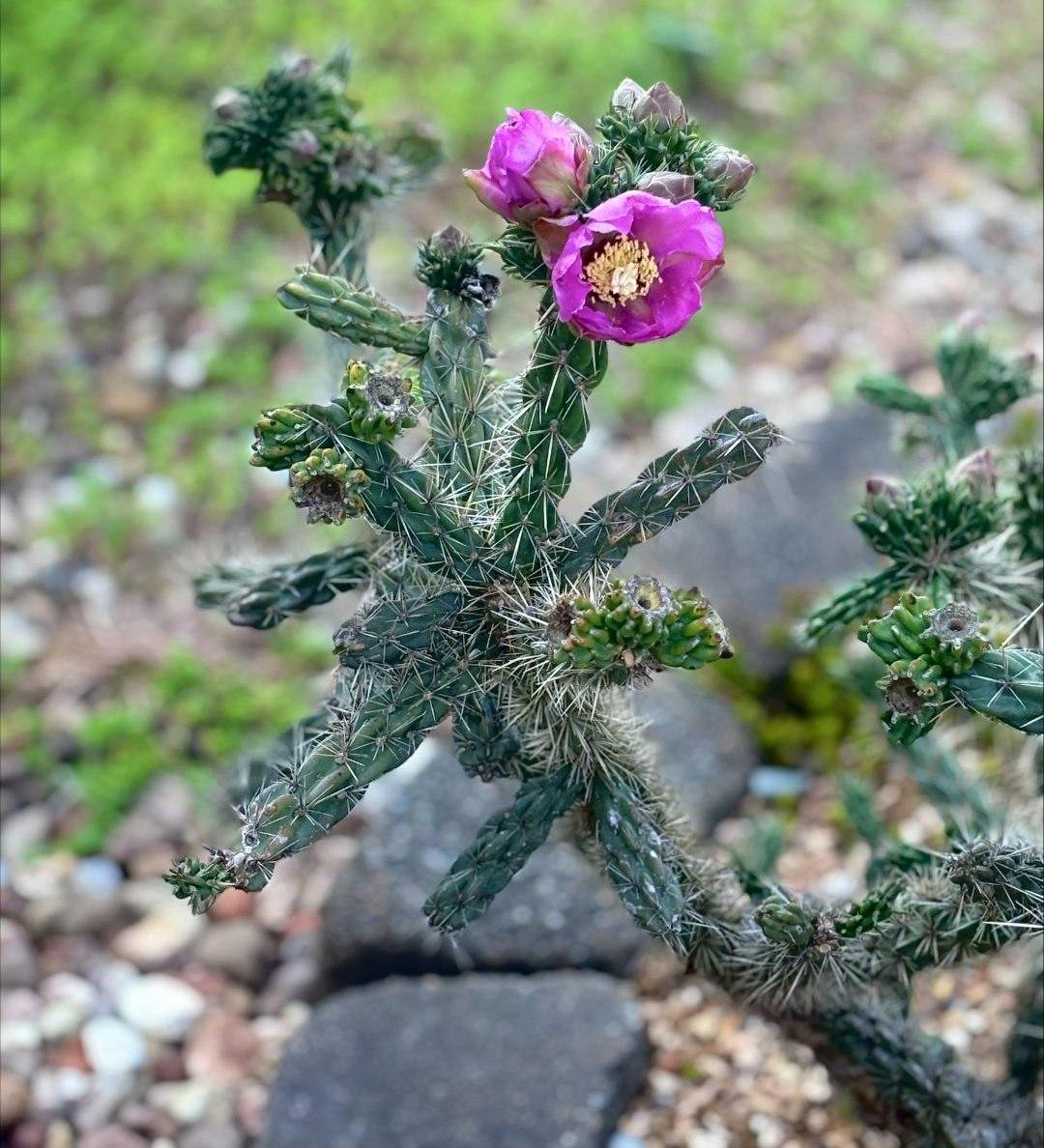 The Cane Cholla Cactus is native to the Southwestern U.S./Northern Mexico. It has withstood MO temps of at least -12 F in the Succulent Garden, located on the southwest corner of the Botanical Center. Very cold temps can kill the potential blooms for the next spring. AKA the “Jumping Cactus” because the spiny segments detach easily to latch onto the clothes of a passerby.