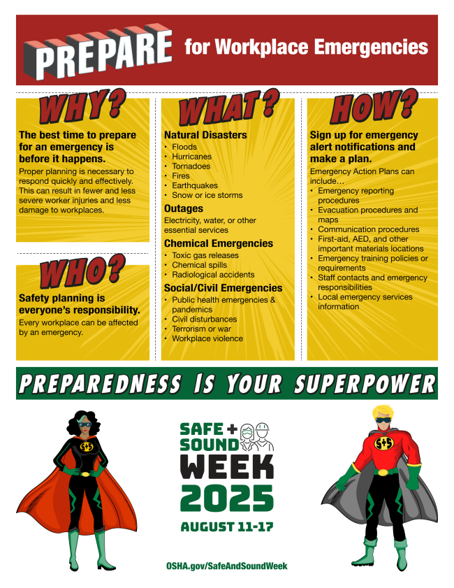 Safe + Sound Week is a nationwide event held each August that recognizes the successes of workplace safety and health programs and offers information and ideas on how to keep America’s workers safe. This year Safe + Sound Week will focus primarily on emergency preparedness and response, a critical topic in construction.