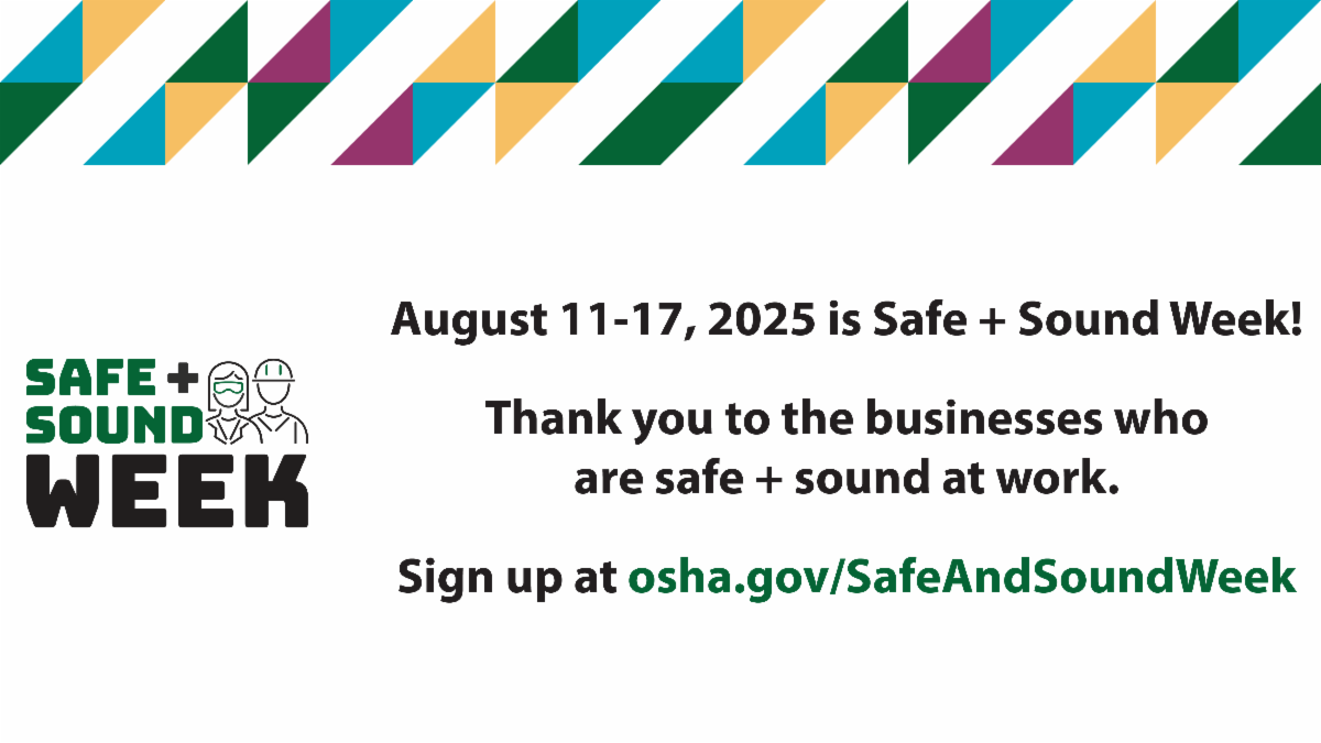 Safe + Sound Week is a great opportunity to showcase your company’s commitment to workplace safety and highlight the strength of your safety culture. Effective safety and health programs help identify and address hazards early, reducing risks, supporting long-term sustainability, and strengthening your bottom line.