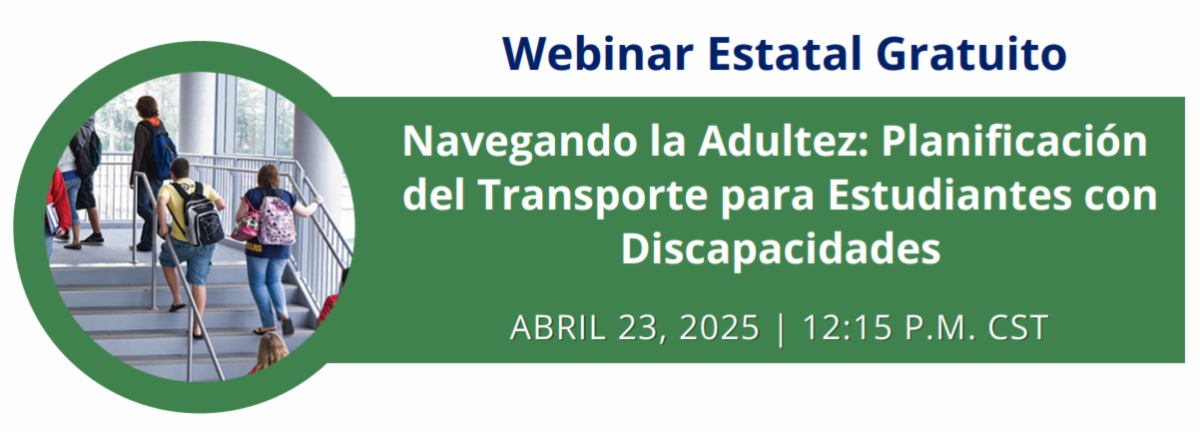 Únase a un seminario web gratuito a nivel estatal el 23 de abril de 2025 a las 12:15 p.m. (CT). Elizabeth Danner, Coordinadora Estatal de Transición de la Agencia de Educación de Texas, nos acompañará para explorar varias opciones de transporte a considerar y para guiar a familias a través de los pasos esenciales que debe seguir mientras su hijo aún está en la escuela. Descubrirá estrategias para ayudar a familias a navegar por el camino hacia acceso confiable y seguro a la comunidad con la mayor independencia posible. Regístrese aquí.