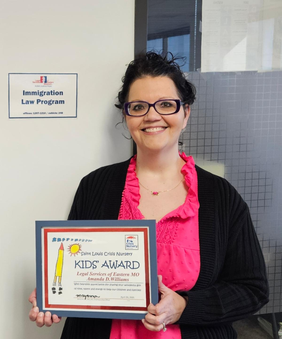 | | LEFT: Geoff Oliver, Program Director of Legal Services' Connecting Kids to Coverage, represents Legal Services at A Red Circle's Annual Community Resource Fair. | ABOVE: In April, Amanda Williams, Senior Staff Attorney with Legal Services' Immigration Law Program, received a Kids Award from the Saint Louis Crisis Nursery in recognition of her work with the Crisis Nursery's LatinX outreach program. | | Legal Services recently celebrated the retirement of two long-standing staff members, Mary Anthony and Missy Waldman. We wish them both a very long and happy retirement! | | BELOW: Richard Sisson, Mary Dyson, Mary Anthony & Kim Allen | | | |