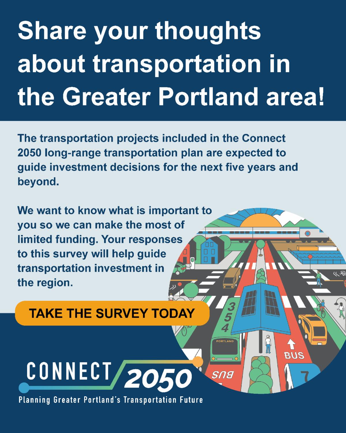 The Portland Area Comprehensive Transportation System (PACTS) is updating its long-range transportation plan and needs your input. The new plan, Connect 2050, will lay out a vision for the future of the Greater Portland region’s transportation system.