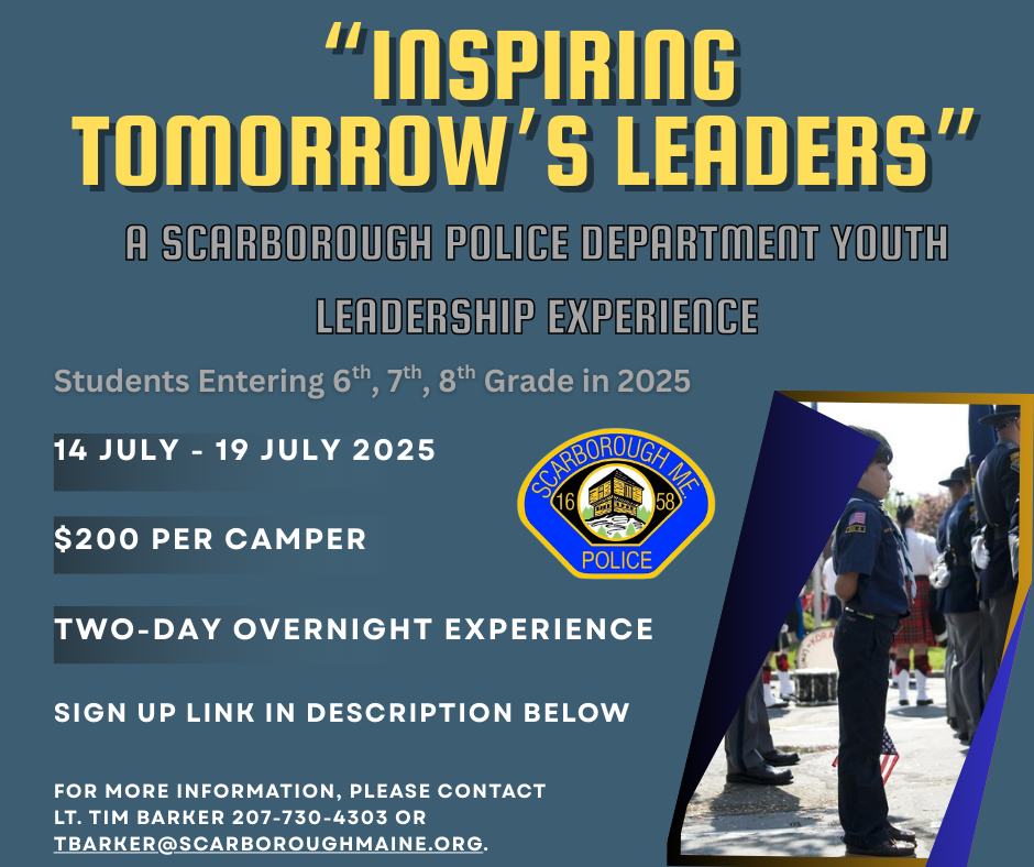 Looking for a Summer Camp for your child entering 6th, 7th, or 8th grade this summer? The Scarborough Police Department is hosting a youth leadership experience called “Inspiring Tomorrow’s Leaders”. It will be held at the Scarborough Police Department from July 14 -19, and includes a two-day overnight rafting experience from July 17-18. Cost per camper is $200 (non-profit) for the entire camp which includes all material, activities, lunches, snacks, and rafting.