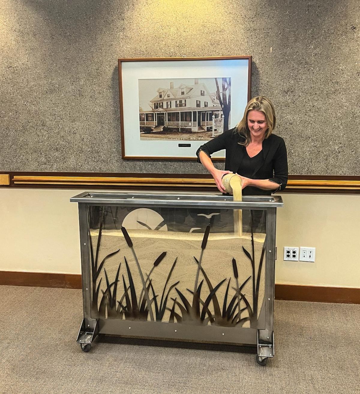 | | Councilor Karin Shupe poured sand into the display to represent newly conserved land. This piece is set up at the entrance to Council Chambers at Town Hall and will serve as a continuous reminder of the Town's achievement and further efforts toward conservation. | | Planning Board Reviews Dunstan Area Affordable & Workforce Housing Project | | |
