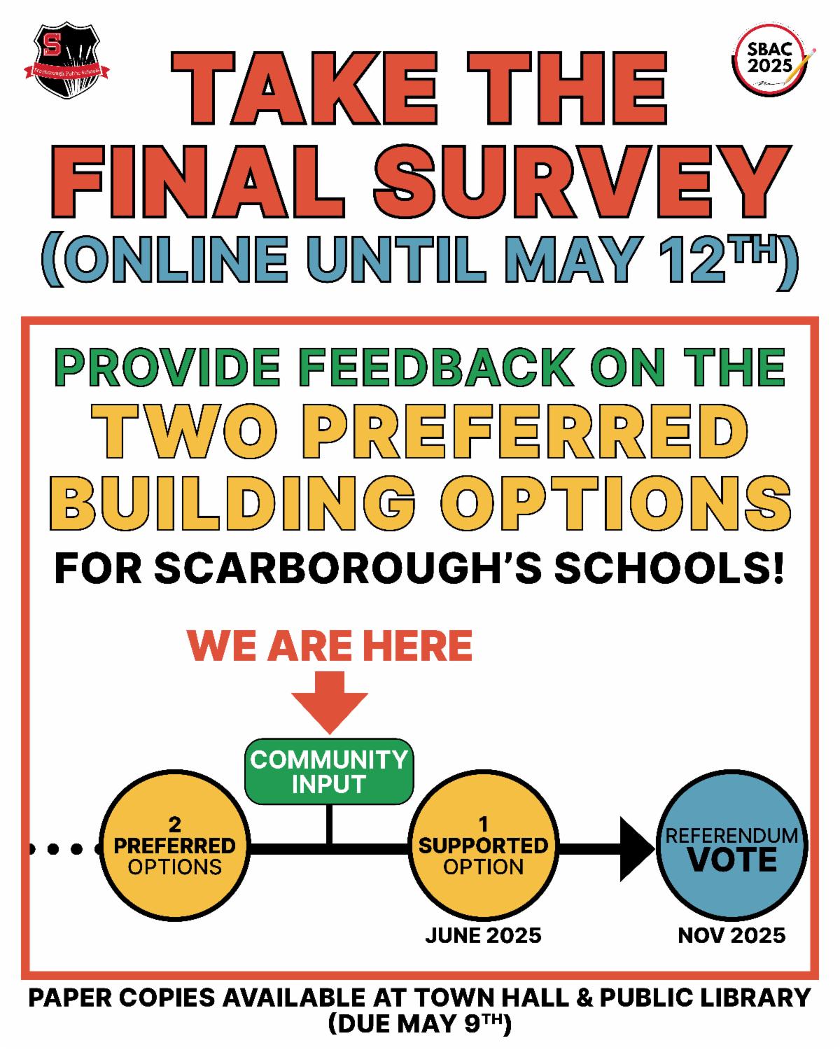 • Late April-Early May: The community survey open until May 12 and seeks public feedback on the two options. Take the survey (online, or pick up a paper copy at the Library or Town Hall and return it by May 9)