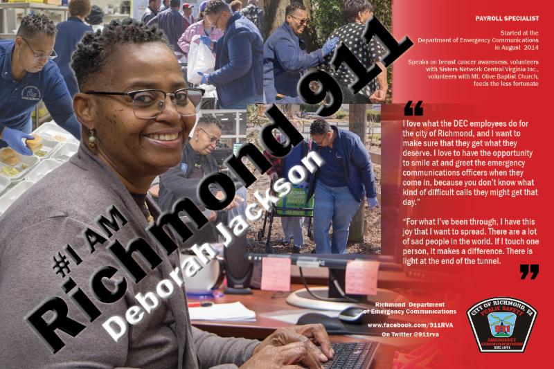 Congratulations to Deborah Jackson, April's honoree for #IamRichmond911. In addition to making sure that all DEC employees are paid accurately, Deborah educates others on cancer awareness, volunteers at her church and feeds the less fortunate.