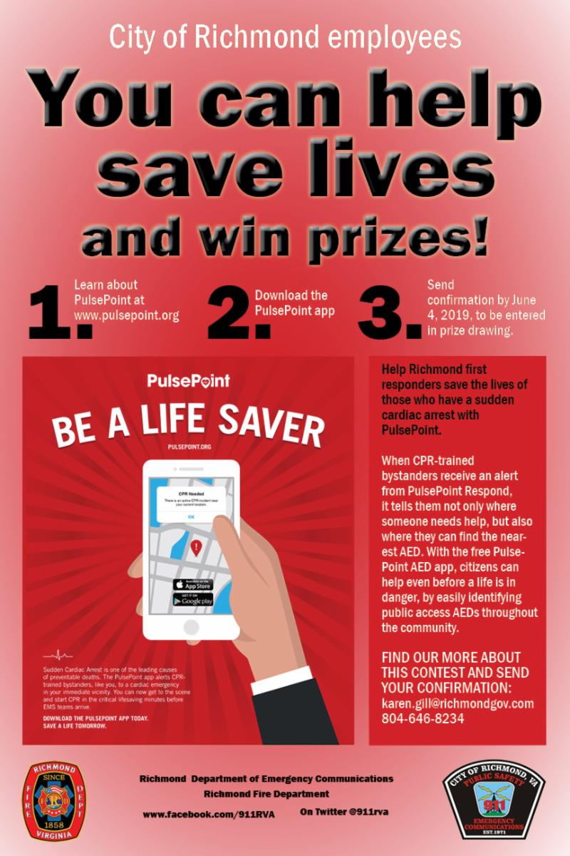 PulsePoint app in Richmond. If you are CPR-trained, you can download the free app to be notified when someone nearby has a sudden cardiac arrest. If you are not CPR-trained, you can use the app to register locations of AEDs. Take a screenshot of the app on your phone and