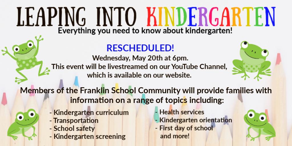 Our Leaping into Kindergarten event has been rescheduled for Wednesday, May 20th at 6pm. It will be live streamed on our Youtube Channel which can be found