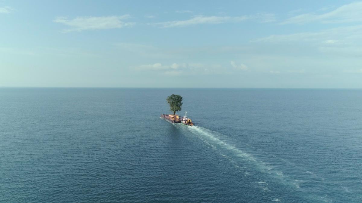 Image Description: In this still from the film "Taming the Garden", a container ship carrying a large green leafy tree moves across the open ocean, just below the horizon on a bright day.