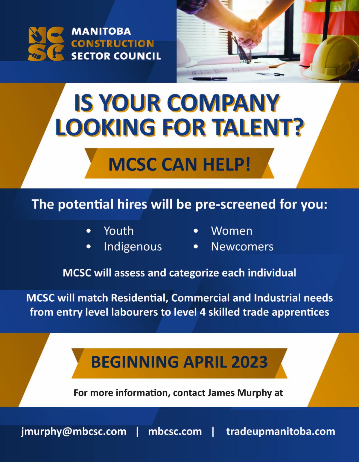 Beginning April 2023 MCSC will help match Residential, Commercial and Industrial needs from entry level labourers to level 4 skilled trade apprentices.