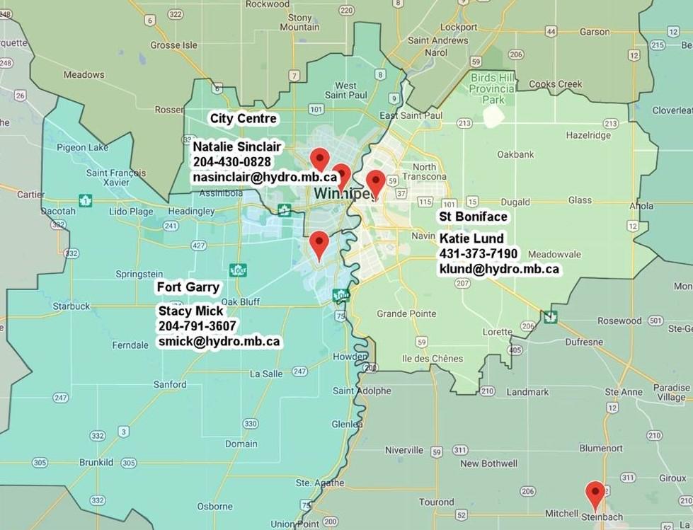 Manitoba Hydro has provided an interactive resource map to help builders find the appropriate point of contact for all areas of the province. This map will allow you to search an address to see which area it falls into in order to find the right contact.