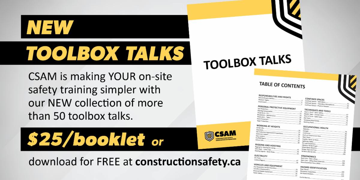 The Construction Safety Association of Manitoba (CSAM) has revamped their collection of toolbox talks to make it easier for you to meet your legislated safety training requirements, as per Section 44 of the Workplace Safety and Health Act.