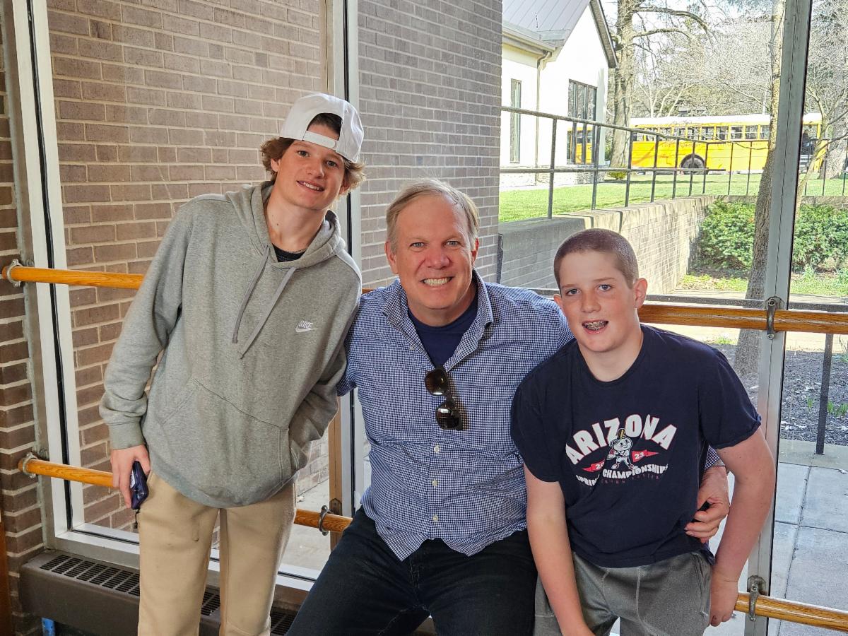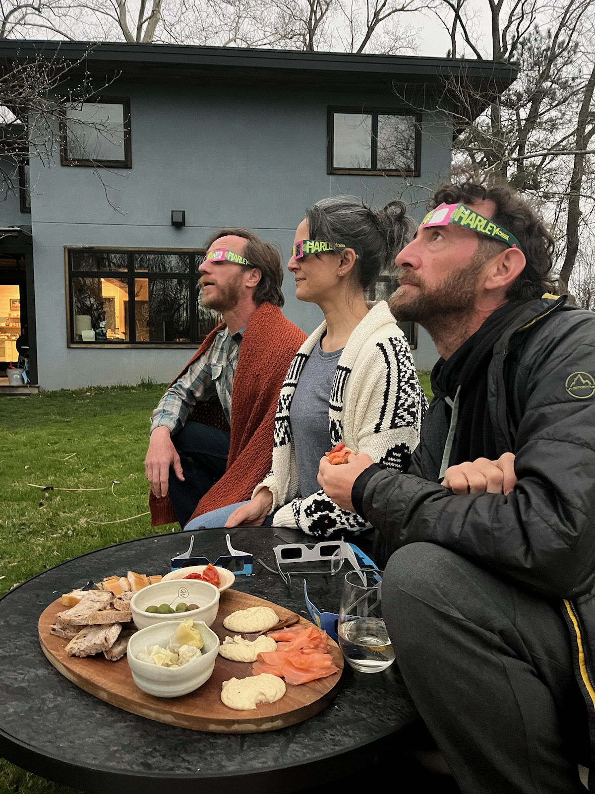 (below) Chris Hartman '93, P '22, '24 (Social and Environmental Sustainability, 2007-2016), Vicki Perovich Hartman '93, P '22, '24, and Mike Hurd '93 got together for the eclipse.