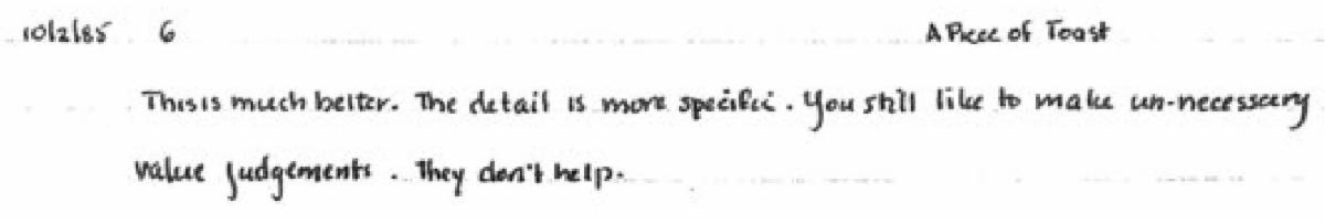 Every time I wrestle with language, trying to find the right words (again, this happens often) I think about the exacting procedure we went through in Mr. Dalton’s English class, of writing a description of some household item—a sneaker, a stuffed monkey, a ballet slipper, a belt buckle—and receiving back his pithy comments, written in tiny capital letters not even half as tall as the distance between the ruled lines of the paper on which he wrote. His comment on my description of a piece of toast, dated 10/2/85: “You still like to make unnecessary value judgments. They don’t help.” Thirty-nine years later, this remains unnervingly accurate. (What value judgments could I possibly have been making about a piece of toast?) But the other lessons—about the value of detailed description and perseverance—have stayed with me.
