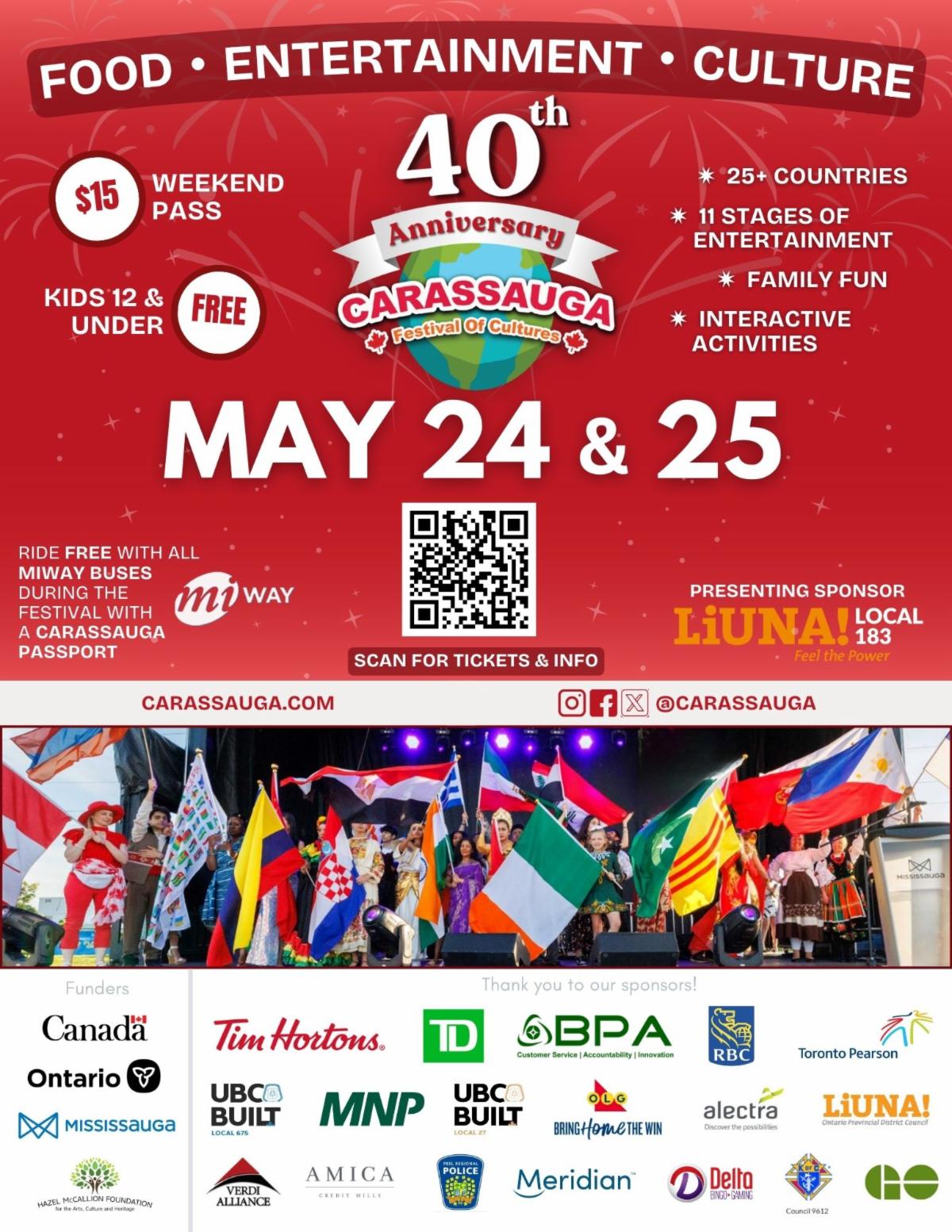 Get ready for the largest multicultural festival in Canada as the Carassauga Festival returns to Mississauga for its 40th anniversary on May 24th and 25th, 2025! This iconic event promises an unforgettable weekend filled with vibrant celebrations, featuring 22 cultural pavilions representing 25 countries. Visitors will have the unique opportunity to immerse themselves in the sights, sounds, and flavours of diverse cultures while exploring the rich traditions that make Mississauga a true mosaic of global communities.