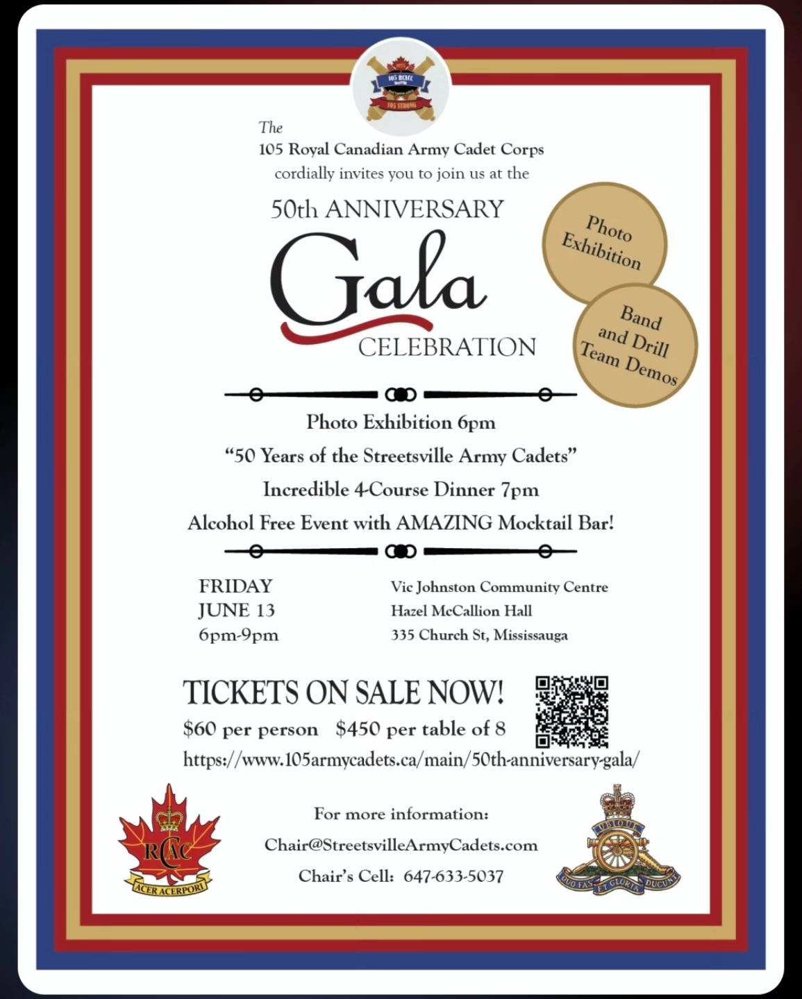 You're invited to join the 105 Royal Army Cadet Corps for their 50th anniversary celebration Gala on Friday June 13th at Vic Johnson Community Center in Streetsville. There will be a photo exhibition showcasing the last 50 years of 105 Streetsville Army Cadets. They will also have band and drill demos. Enjoy a four course delicious meal and an amazing mocktail bar will be open serving military themed non-alcoholic drinks. Visit the 105 Army Cadets website for more information and to purchase tickets at www.105armycadets.ca.