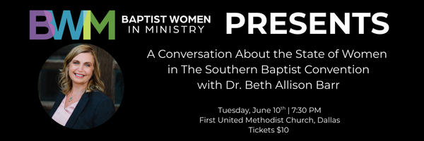 As the Southern Baptist Convention holds its Annual Meeting in Dallas, BWIM will host a conversation about the state of women in the SBC with Dr. Beth Allison Barr on Tuesday, June 10, 2025 at 7:30pm at First United Methodist Church of Dallas.