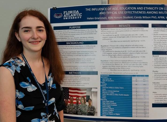 As an undergraduate Owl, Freshman Direct Admit BSN student Helen Grammen has combined her passion for research and women’s health. Under the mentorship of Dr. Candy Wilson, Christine E. Lynn College of Nursing associate dean for Nursing Research and Scholarship and professor, she has been studying the influence of age, education and ethnicity on contraceptive choice and typical use effectiveness among military women.