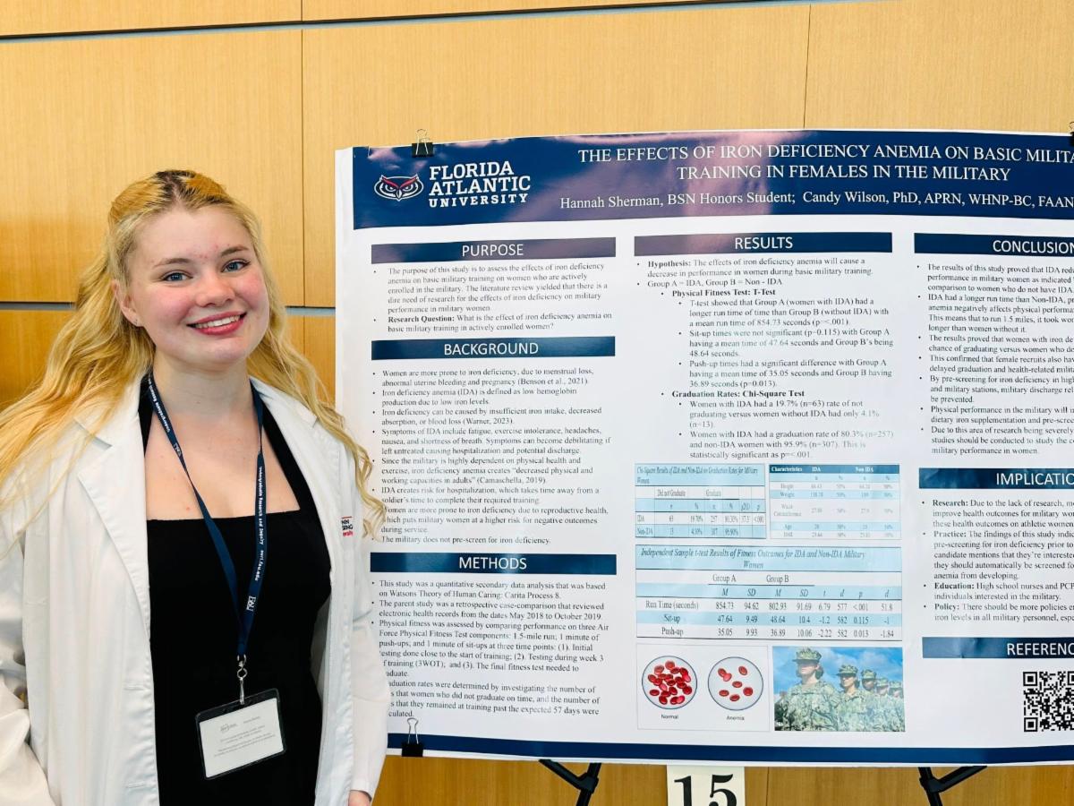 Honors BSN student Hannah Sherman earned second place in Section II at the 15th annual Undergraduate Research Symposium on April 4, hosted by Florida Atlantic University's Office of Undergraduate Research and Inquiry (OURI). Her presentation, “The Effects of Iron Deficiency Anemia on Basic Military Training in Females in the Military,” was mentored by Dr. Candy Wilson.