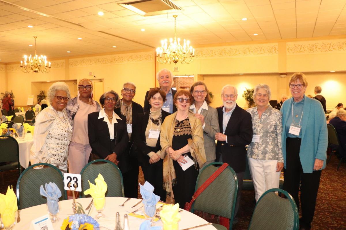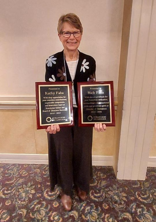 La presidenta de Strangers No Longer, Judy Brooks, con premios a los miembros fundadores Kathy y Rich Faba, por sus años de voluntariado en muchas capacidades, incluido Rich como presidente del Comité de Incidencia y Kathy, quien actualmente es secretaria de la junta. La familia Faba recibió una gran ovación de los asistentes.