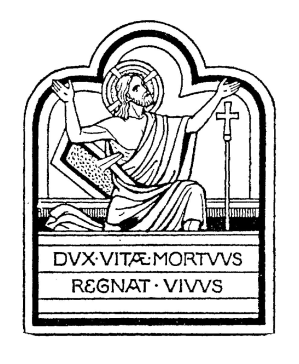 Image of Christ rising from the grave. The Latin text reads: the dead Leader of life reigns