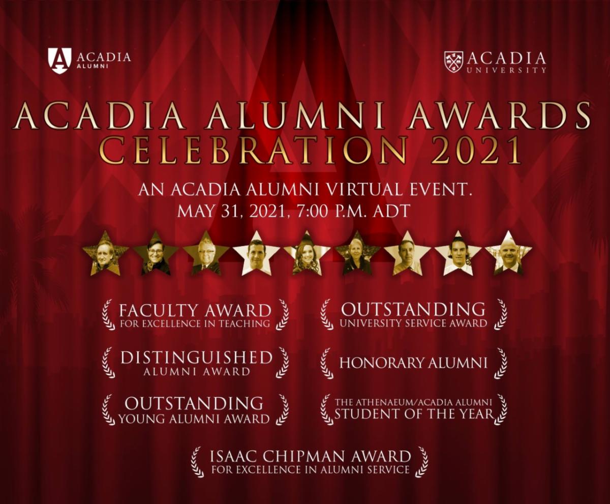 Acadia Alumni Awards Celebration 2021 - Acadia President Dr. Peter Ricketts, Alumni Association President Donalda MacBeath (’75), Executive Director, Alumni Affairs Oonagh Proudfoot (’93, ’06), and Alumni Awards Committee Chair Jeff Aucoin (’96) will welcome members of Acadia’s alumni community live on Microsoft Teams to officially launch this year’s celebration at 7 p.m. ADT on May 31.