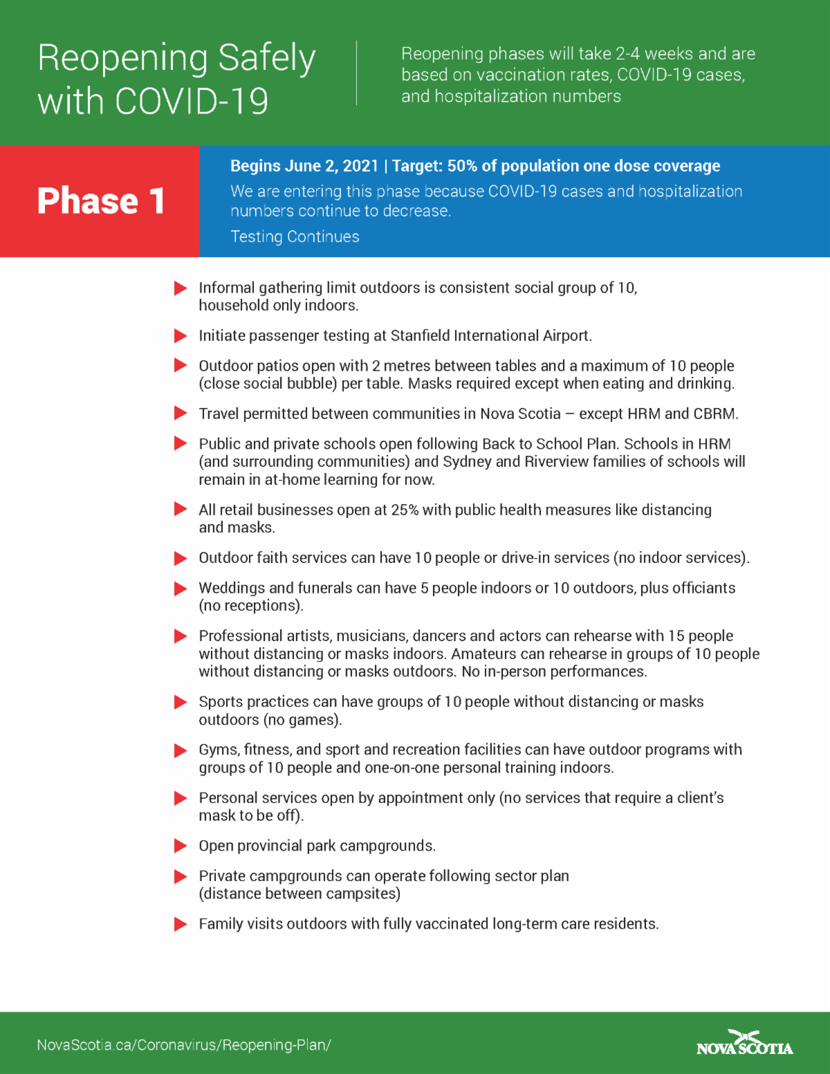 Health and Wellness - Premier Iain Rankin and Dr. Robert Strang, Nova Scotia’s chief medical officer of health, announced on May 28, that the province will reopen gradually under a five-phase plan.