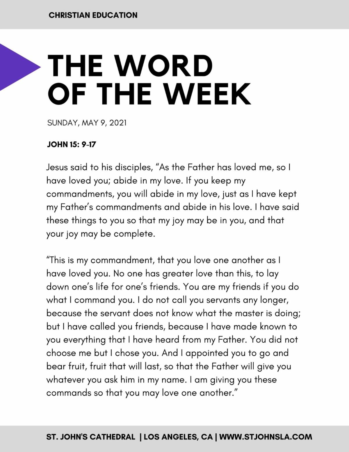 Join us for Chrisitan Education in-person or online via Zoom. This week we will start studying and discussing Sunday's Gospel of the day. This Sunday's reading is John 15: 9-17l, you can get a head start and start gathering any questions you have. We look forward to hearing them this Sunday starting at 10:30 am.