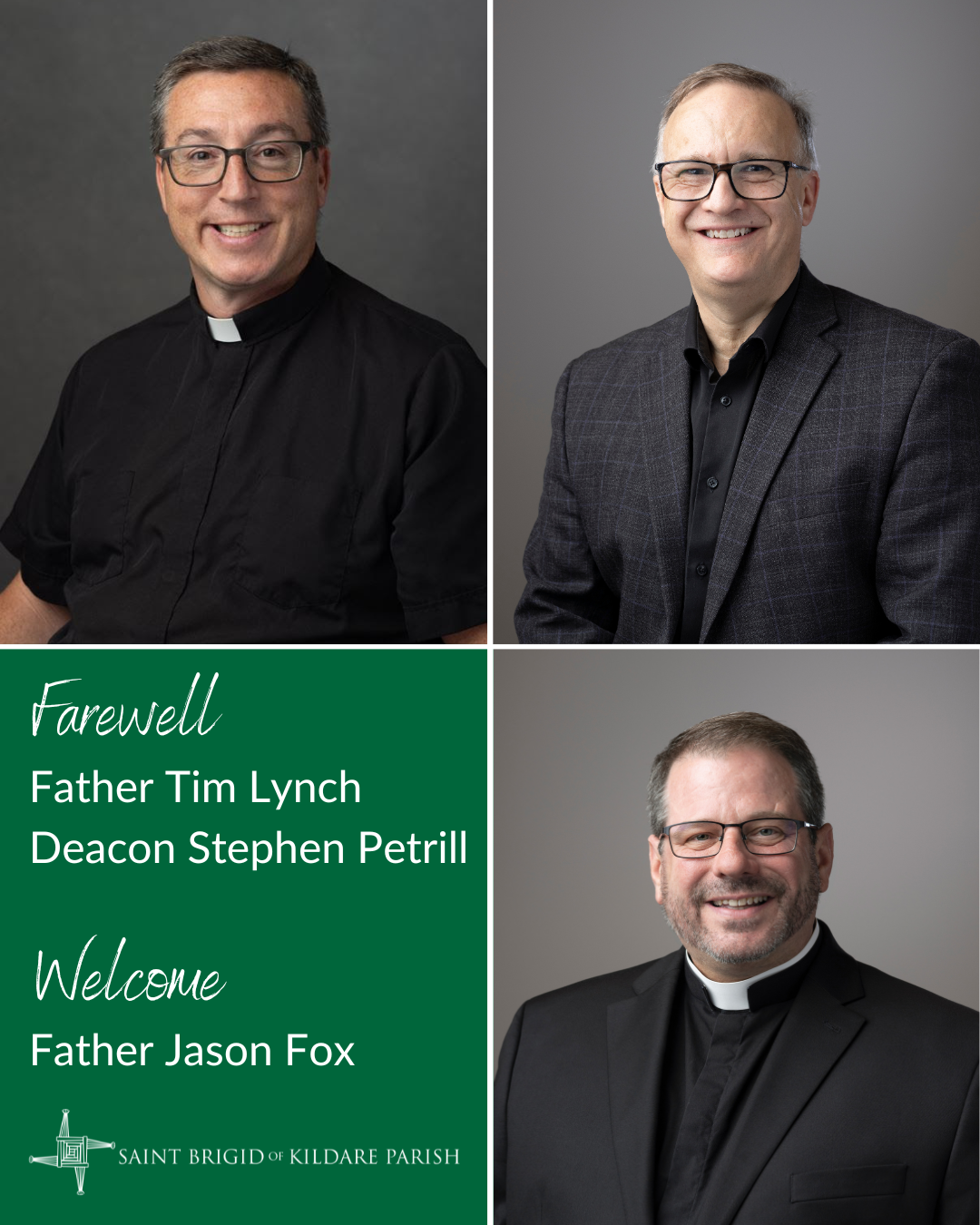 Join us at Brigid's Green on Sunday, June 29th at noon for a Parish Picnic to say farewell to Father Tim Lynch and Deacon Stephen Petrill, and to welcome our new parochial vicar Father Jason Fox.