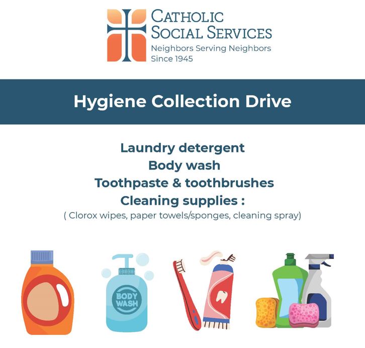 The weekend of May 24 & 25, the Social Action Committee will be outside Hendricks Hall before and after all Masses collecting hygiene & cleaning supplies to benefit Catholic Social Services.