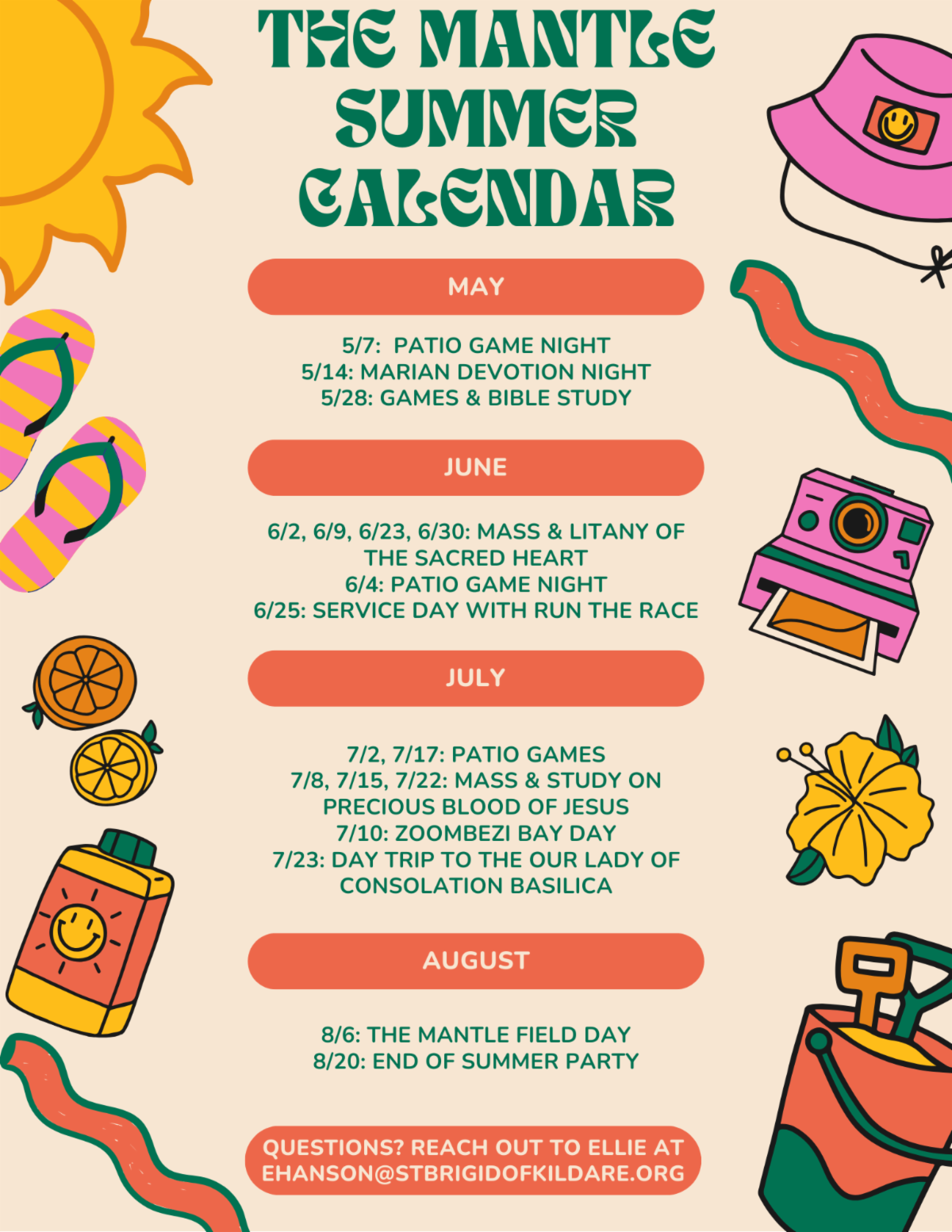 All those entering into their freshman to senior year of high school in the Fall of 2025 are welcome to come and join us at our events. If you have any questions, comments, or concerns, please reach out to Ellie Hanson at ehanson@stbrigidofkildare.org.