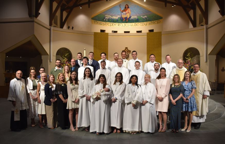 Newly Baptized: There were 15 adults baptized at the Easter Vigil, and one newborn infant of one of our newly baptized, who received the sacrament right after his mother! The 15 adults also completed their Sacraments of Initiation — being Confirmed and receiving the Eucharist for the 1st time.