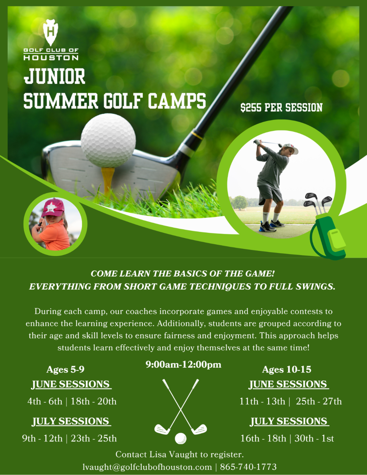 Golf Club of Houston is hosting a junior summer camp for curious golfers! This is open to members and non-members! To register, contact Lisa Vaught with the button below: