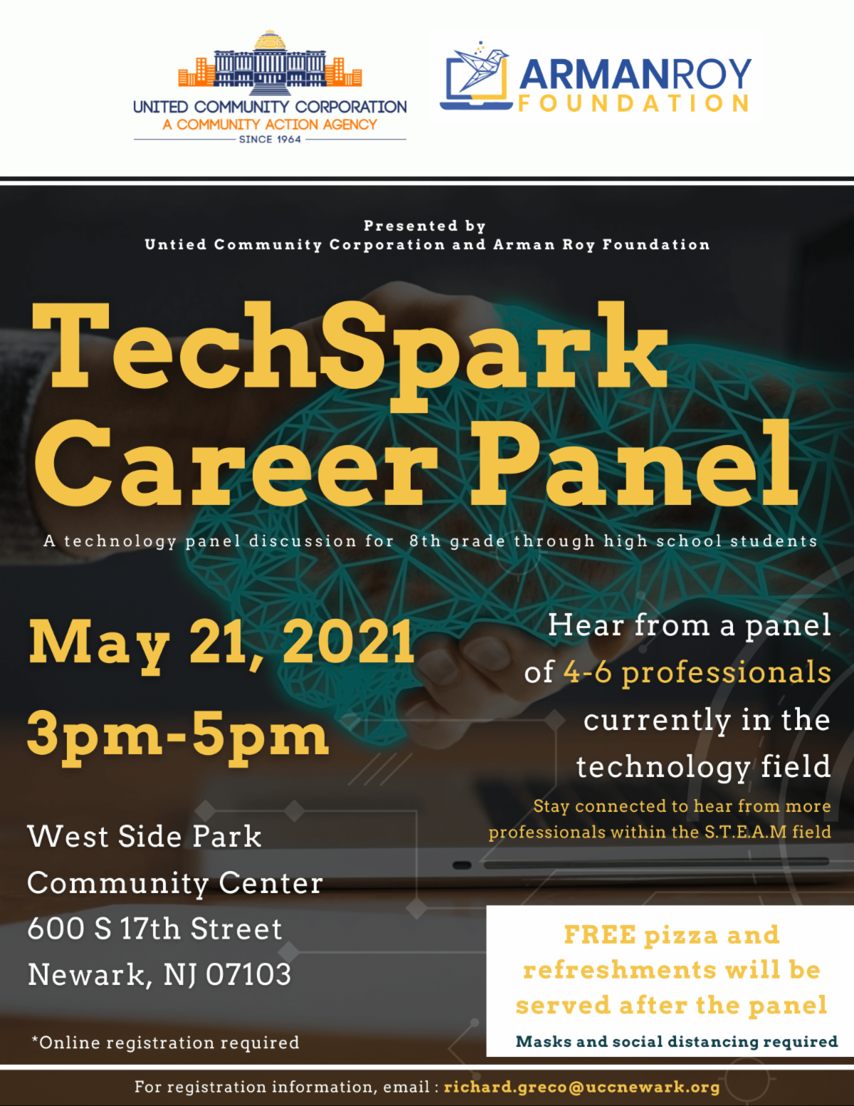 UCC along side Arman Roy Foundation will be hosting a TechSpark Career Panel which is one of a few panel discussions for 8th through 12th grade students with an interest in careers in the S.T.E.A.M fields. Participants will get the chance to hear from and speak with 4-6 professionals within the technology field.