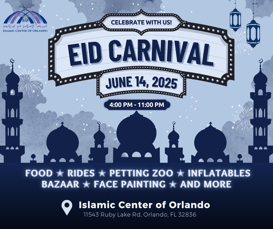 Join Islamic Center of Orlando for a day of rides, inflatables, a petting zoo, face painting for the kids, and much more. You can also enjoy a variety of food options available for purchase, explore our bazaar, and much more. Everyone is welcome to celebrate, eat, and enjoy the Eid festivities with us!